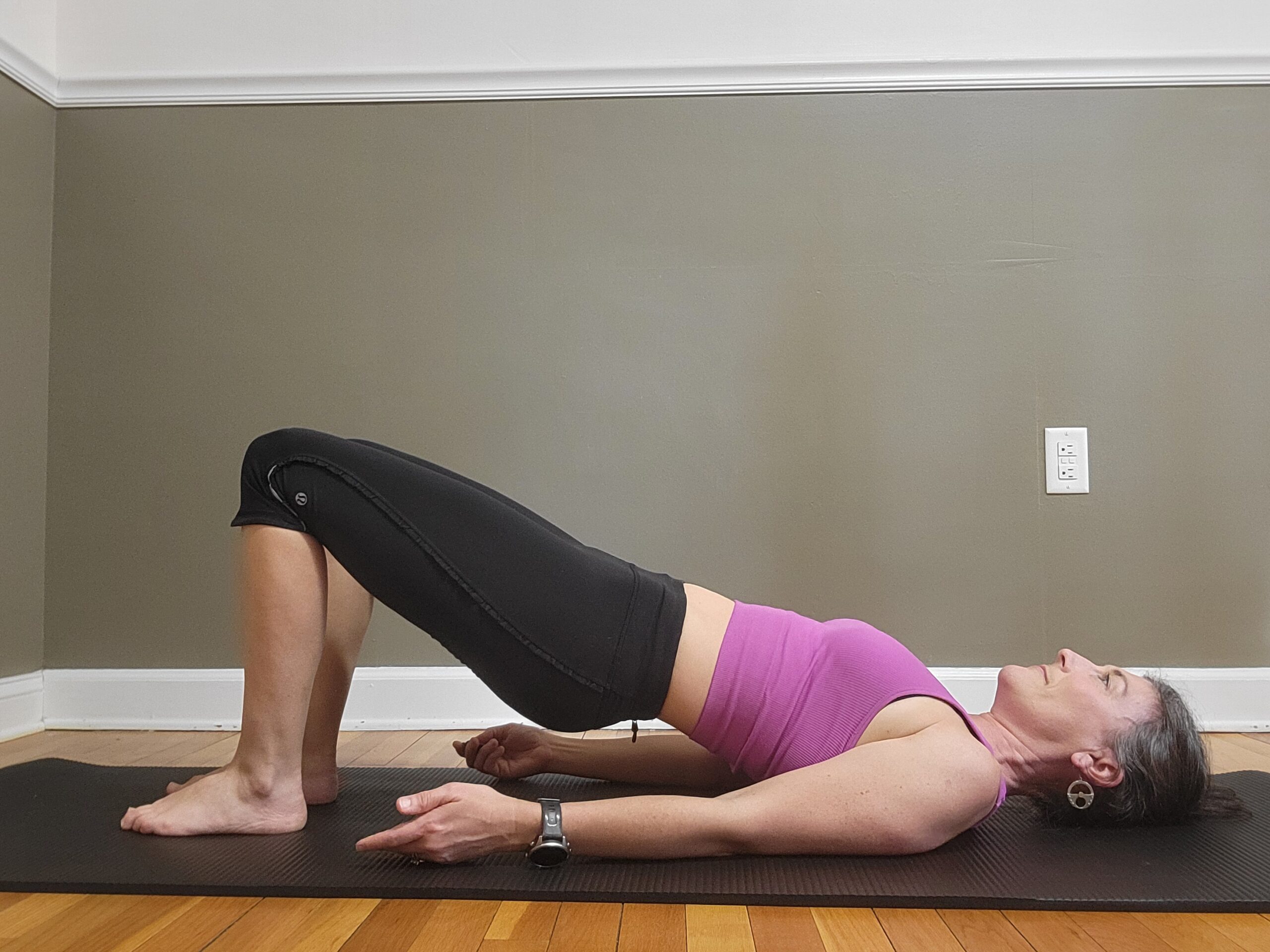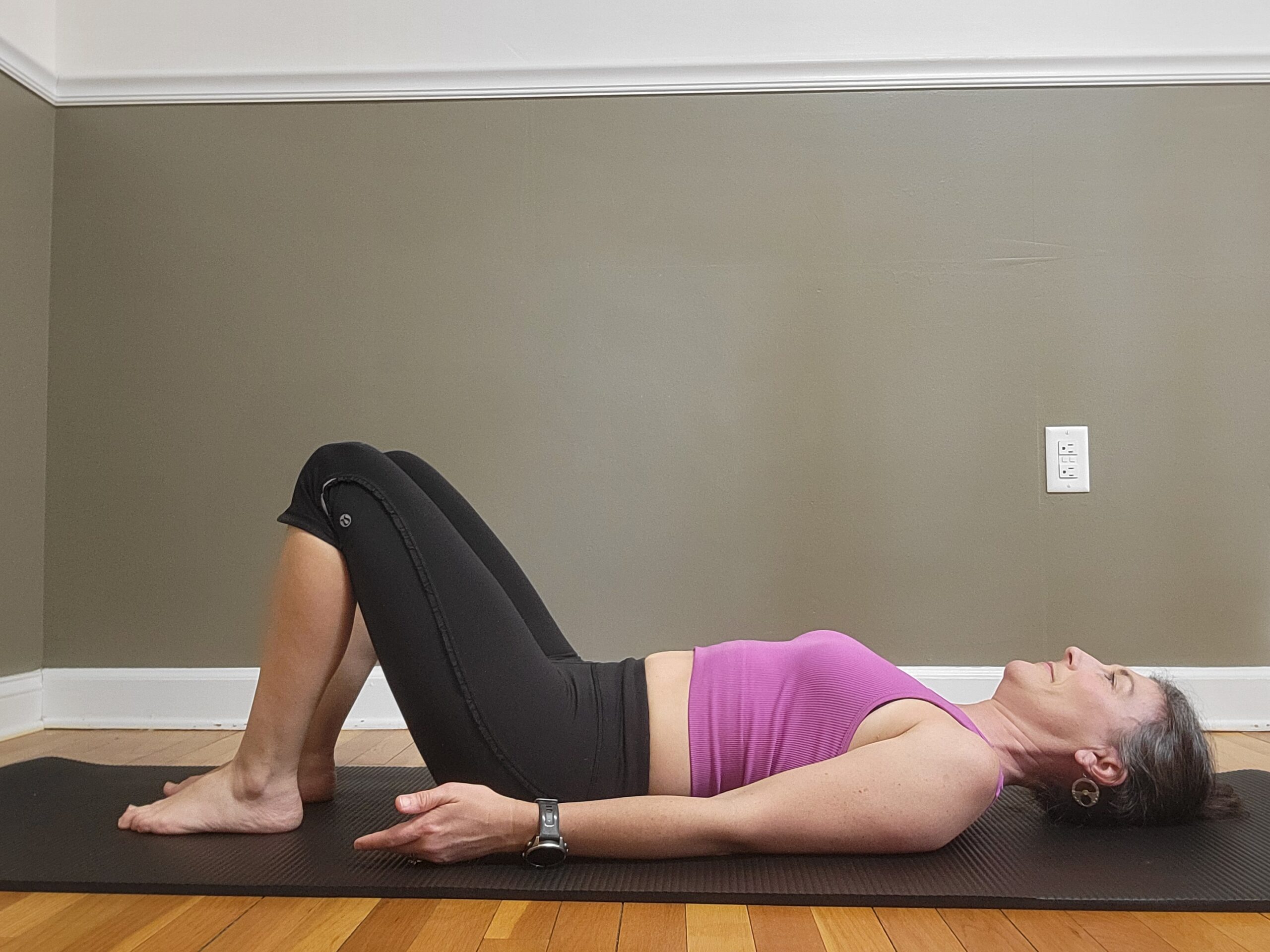 - Exhale: Keep the hips lifted while lowering the ribs first, placing the spine back down to the floor one spine segment at a time until the tailbone and hips touch down last.