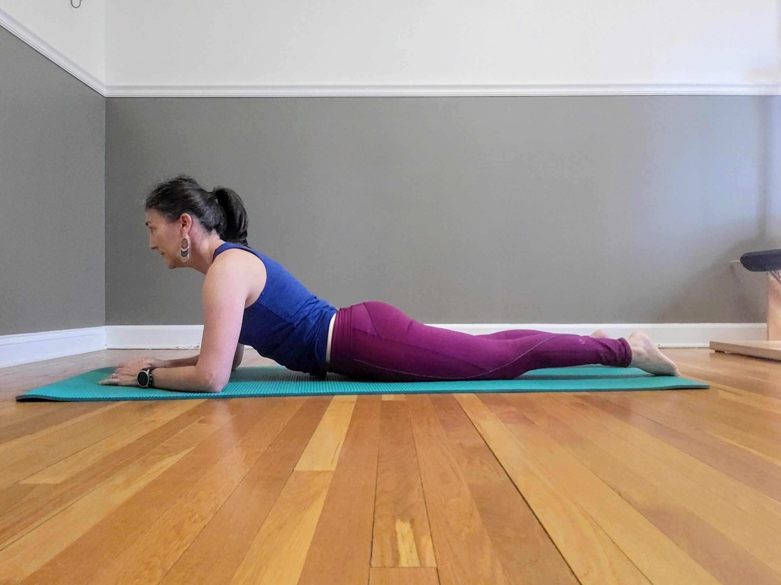 - Lay on your stomach. Prop up on your forearms with hands together at the midline.