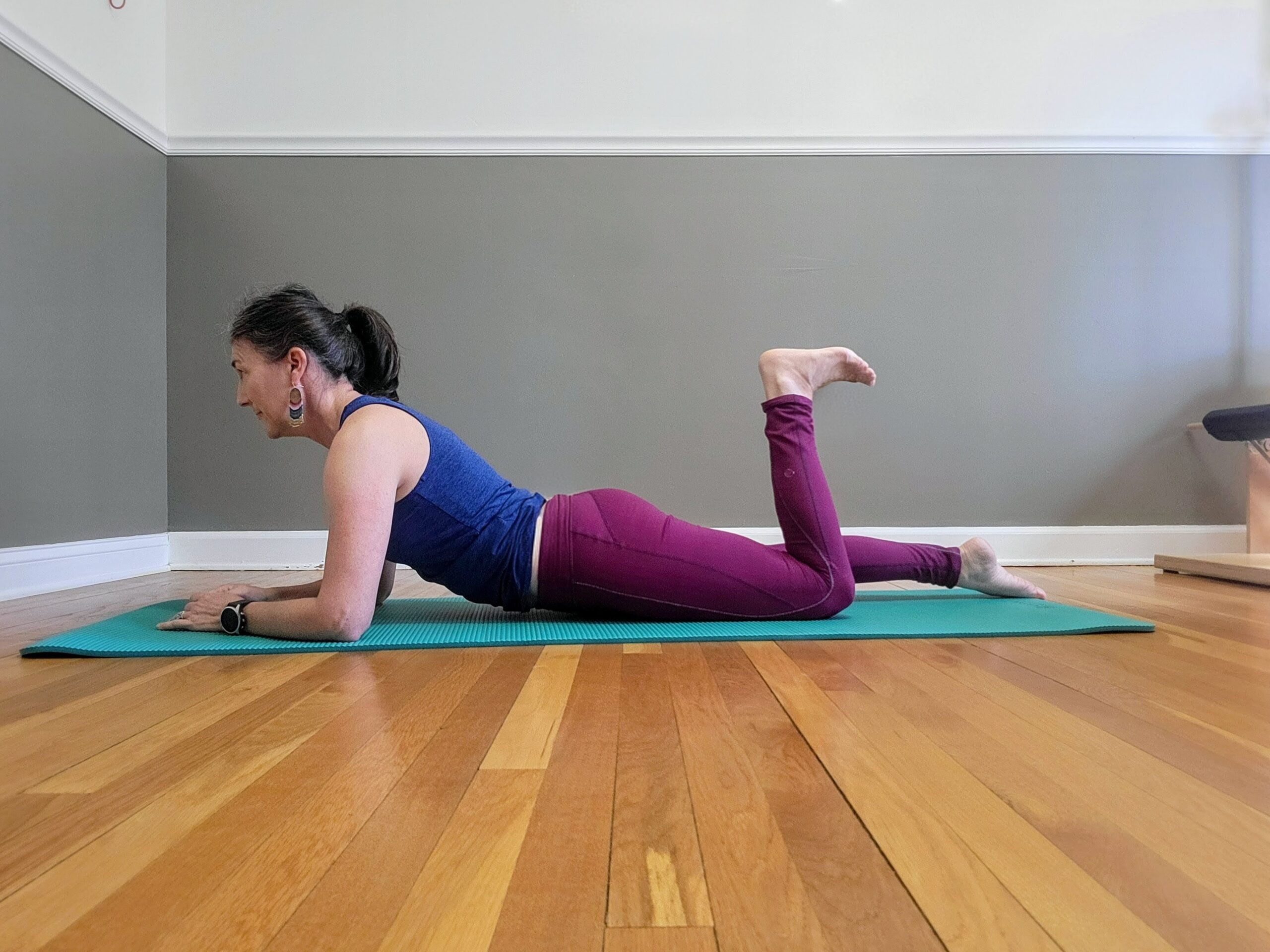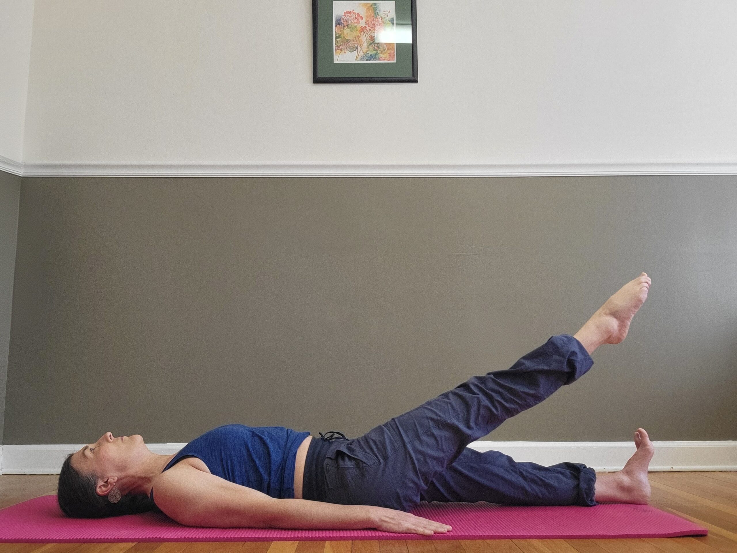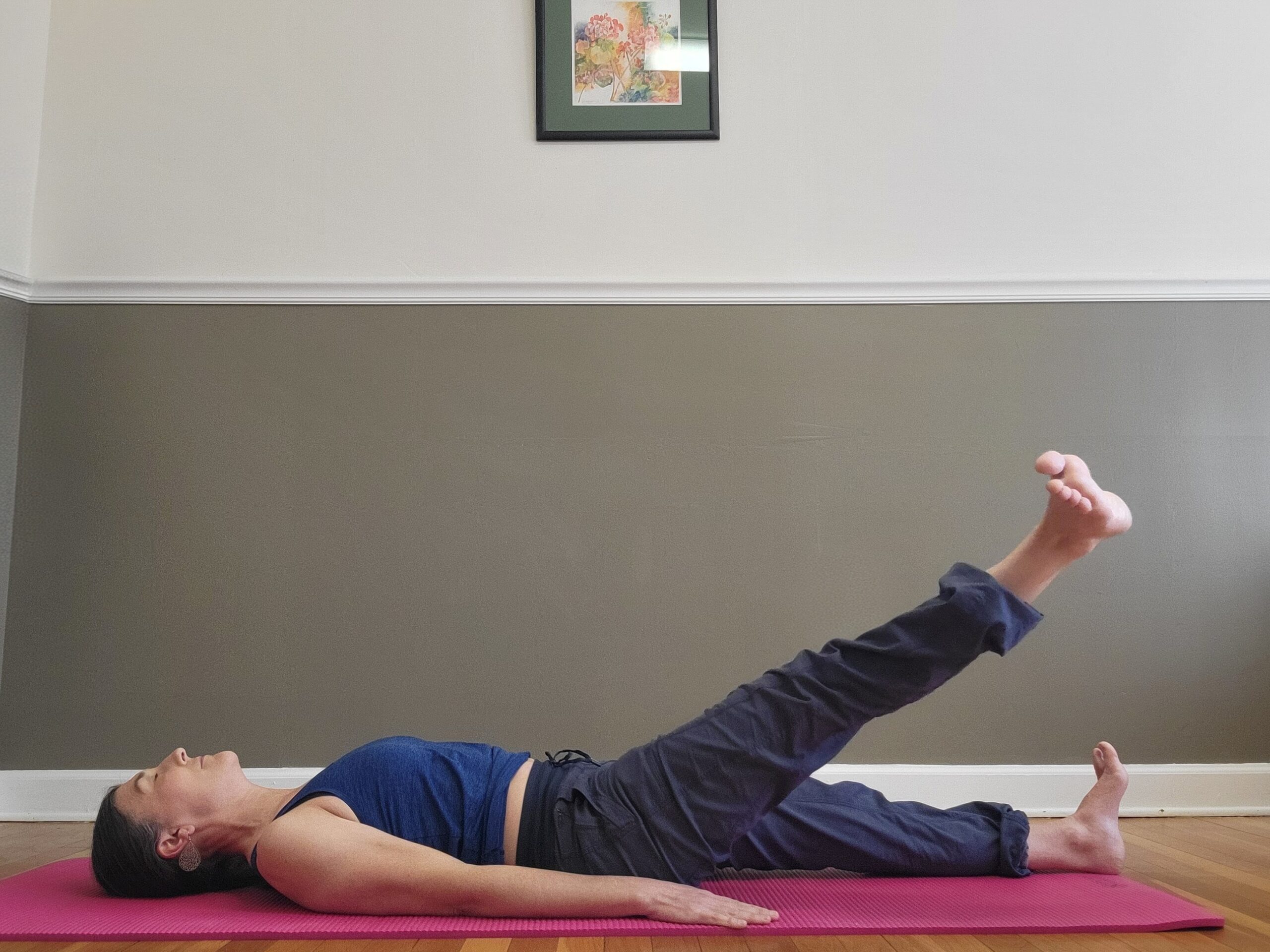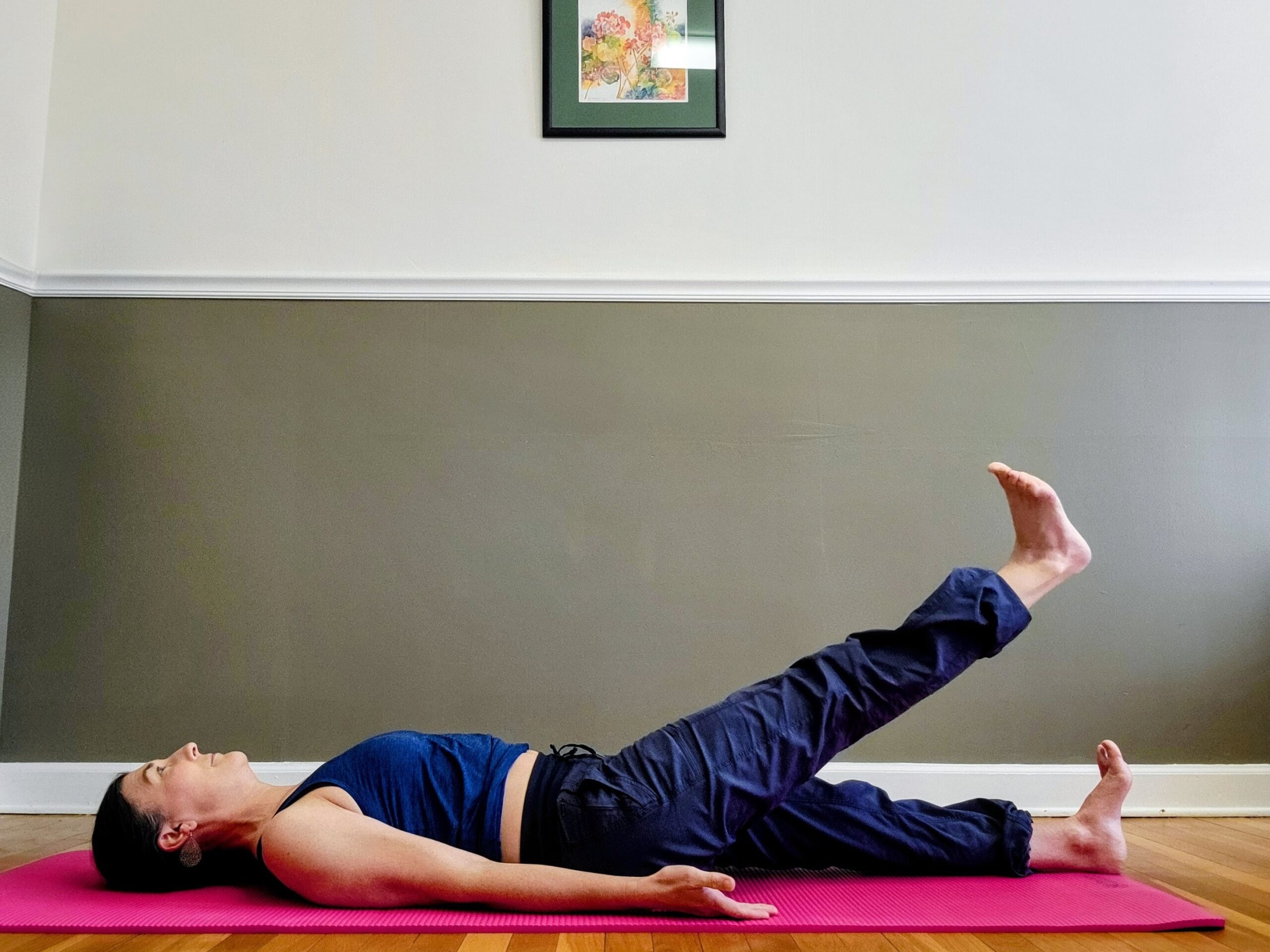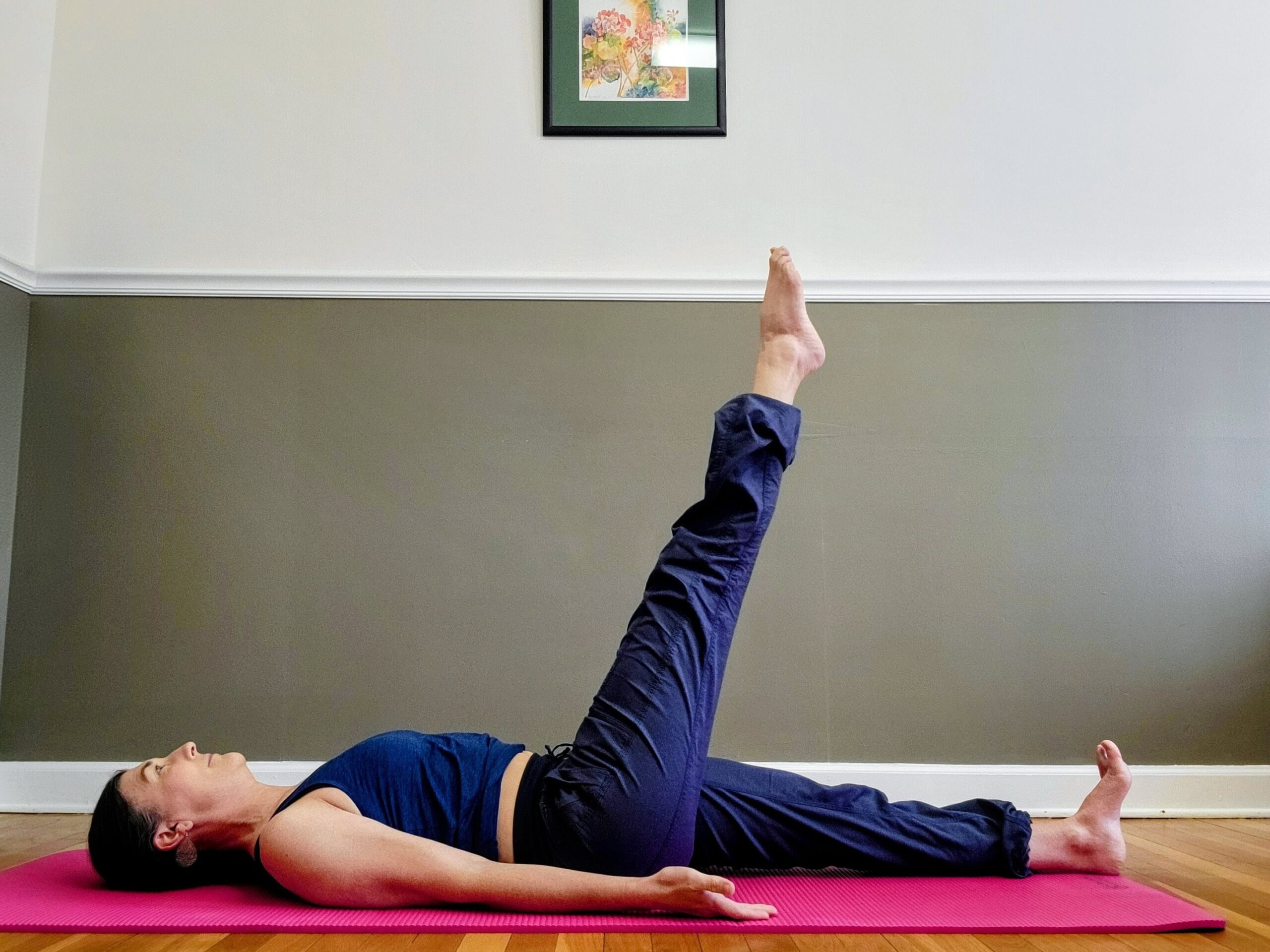 - Inhale: Lift the right leg toward the ceiling until you feel a stretch along the back of the leg.