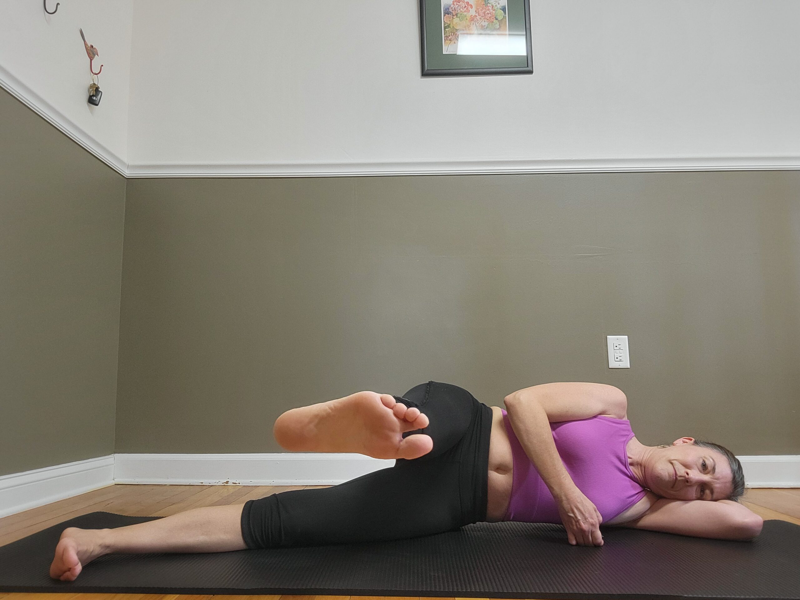 - Lay on your side with legs slightly piked in front of your body.