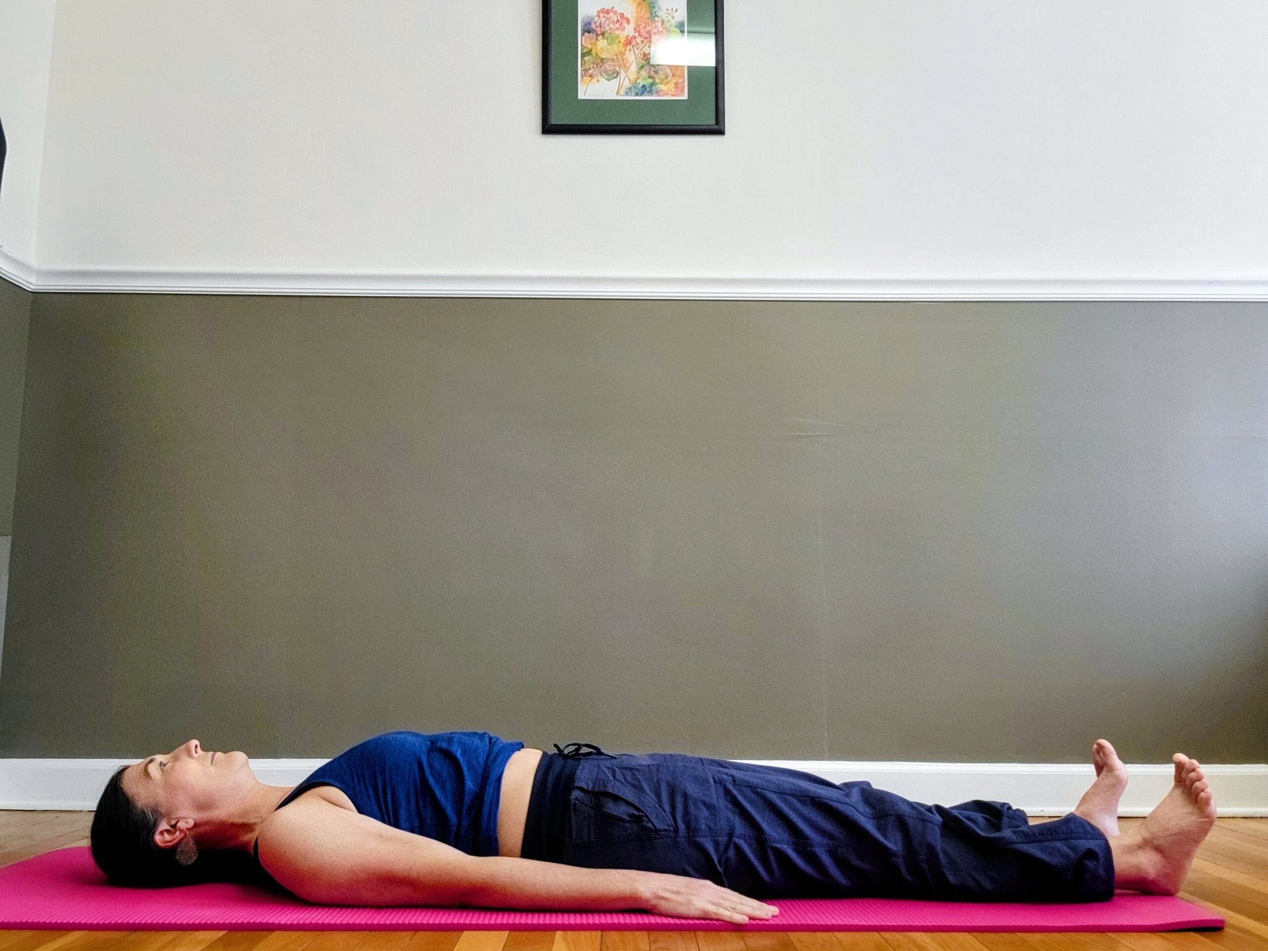 - Lay on your back, legs straight, arms by your side (palms down).