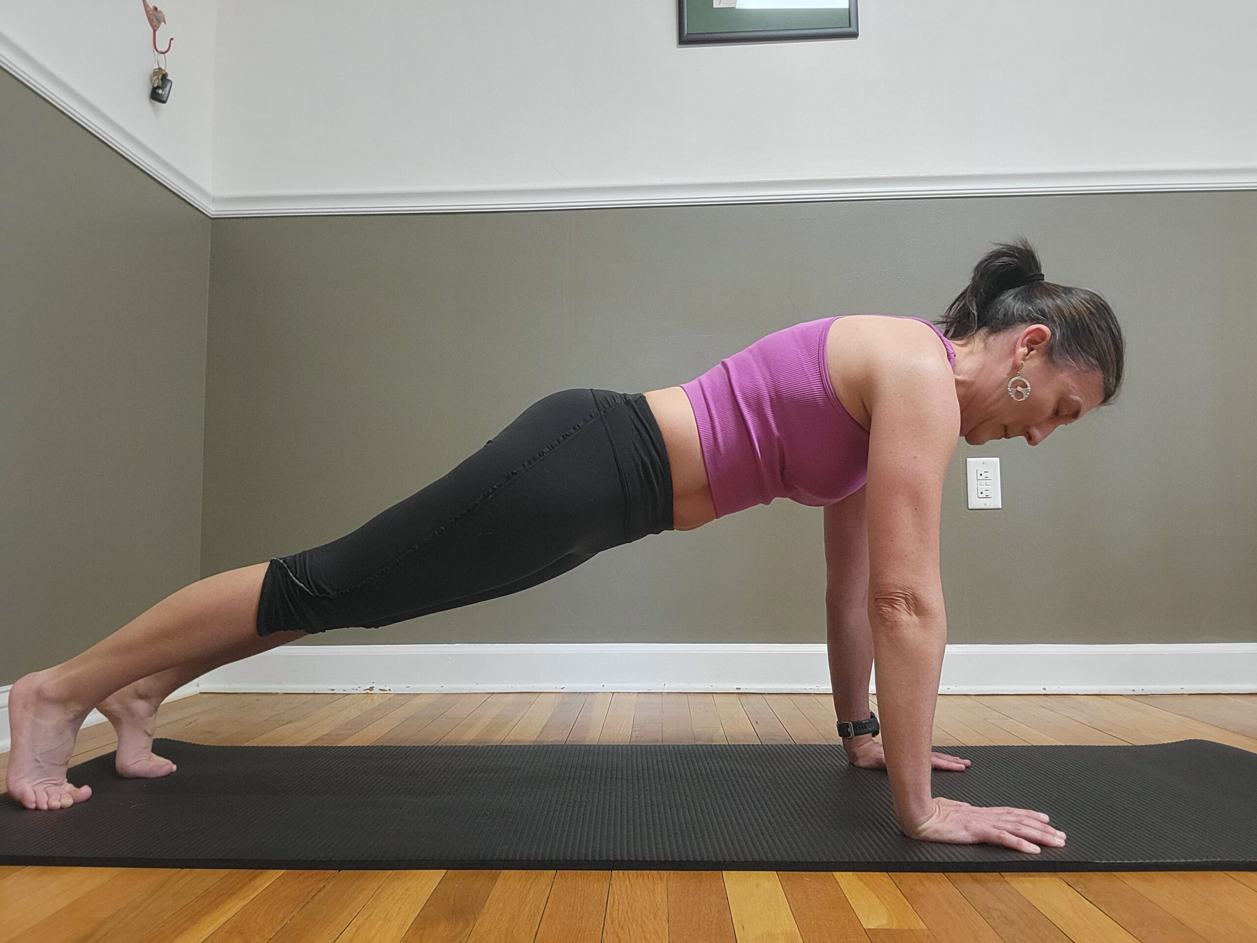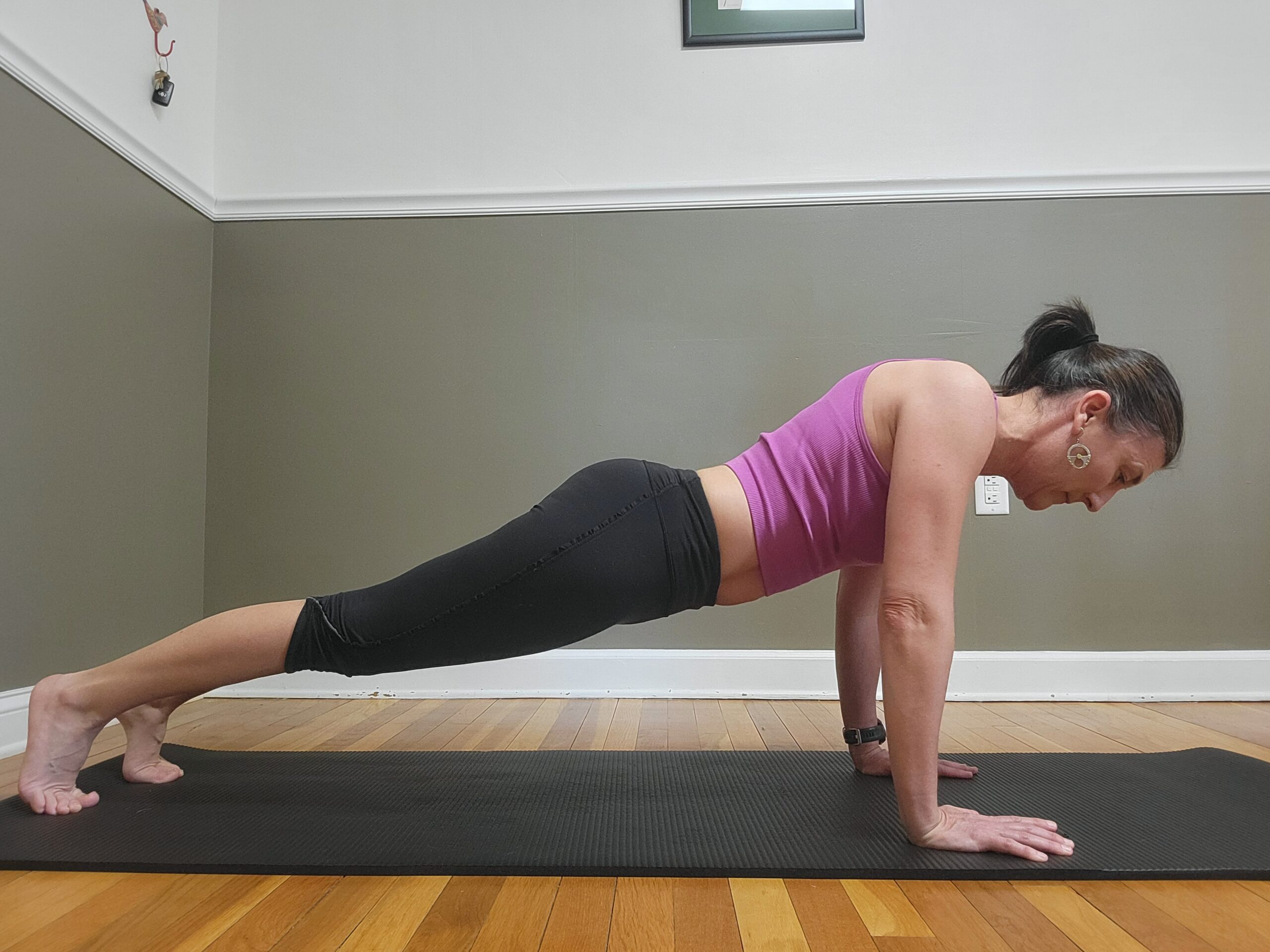 - Draw your shoulder blades down as though pushing the ground away with your forearms.